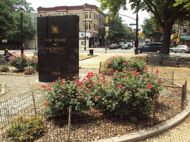 Inside the park, a horticultural bed and pairs of benches face the Bartel-Pritchard Square War Memorial. This polished black granite monument was dedicated in 1965 to honor all the soldiers in the community who gave their lives for the country. Its inscription reads, "For Valor and Sacrifice."